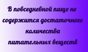 Как бы мы не старались следовать рекомендациям диетологов и идти по пути правильного питания, маловероятно, что мы полностью удовлетворим наш организм питательными веществами. Современная аграрная промышленность не ориентирована на содержание питательных веществ в продуктах питания, которые мы покупаем в магазинах.Пища не содежрит необходимых питательных веществ Сегодняшняя наша пища далеко не всегда содержит необходимые организму вещества в достаточном количестве. Да и разговоры о полезности собственного дачного участка не более, чем просто разговоры ни о чем.