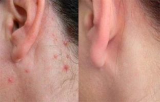 = Прыщи на шее и в волосах. Использовала спрей Аурикум, лосьон Body и шампунь Hair. Вторая фотография через 3 недели.
