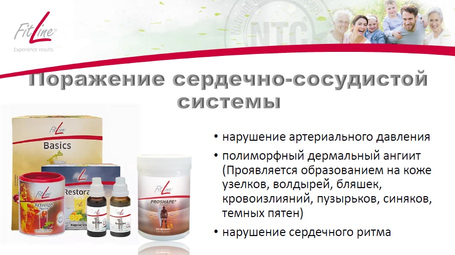 Есть такое осложнение полиаморфный дермальный ангиит. В переводе с медицинской терминологии это означает воспаление сосудов, которое проявляется тем, что на коже появляются узелки, волдыри, бляшки, кровоизлияния, пузырьки, синяки, темные пятна. Это всё воспаление не самой кожи, а сосудов. Поэтому продукция Fitline помогает очень хорошо восстанавливать организм.